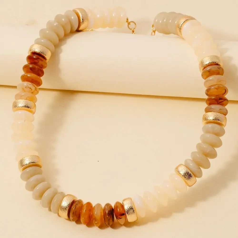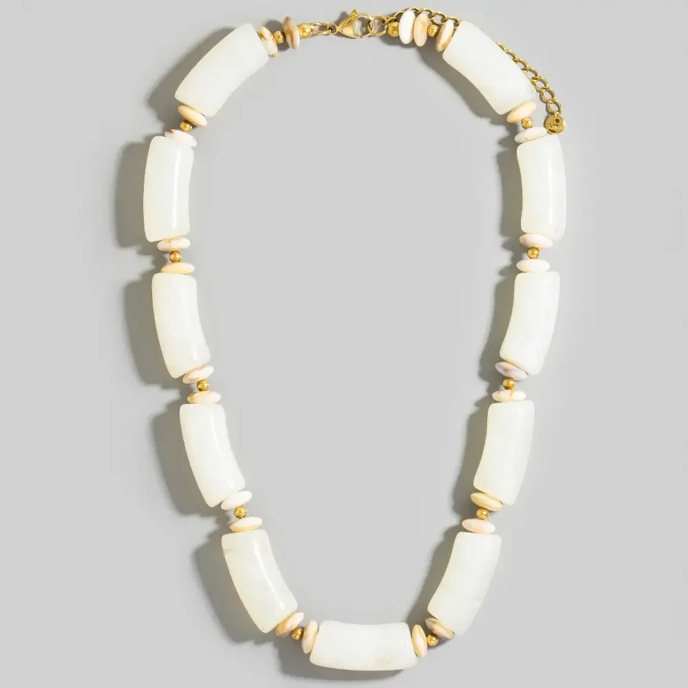 This layered necklace is made with 20% Steel 40% Denim 20% Zinc 20% Glass Stone.